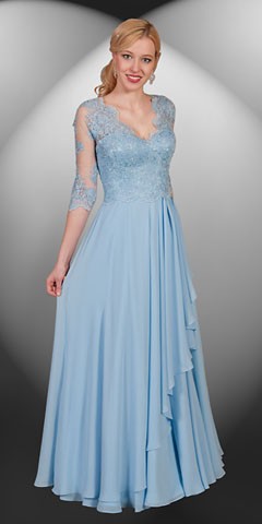Bleděmodré šifonové šaty s rukávkem, francouzské šněrování. SP 331. Velikost 42 - 44 Cena půjčení 2500 Kč objednat